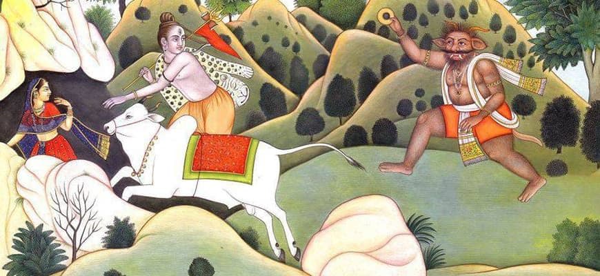 Тогда демон направился к Шиве со словами: «Теперь я хочу положить свою ладонь на твою голову, чтобы проверить действие благословения!» Шива испугался и побежал прочь от демона. Он думал: «Кто же защитит меня?»