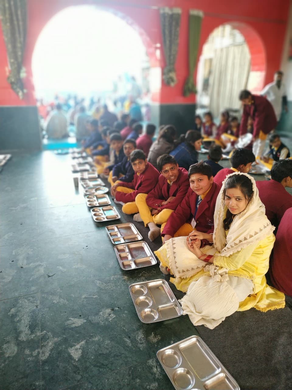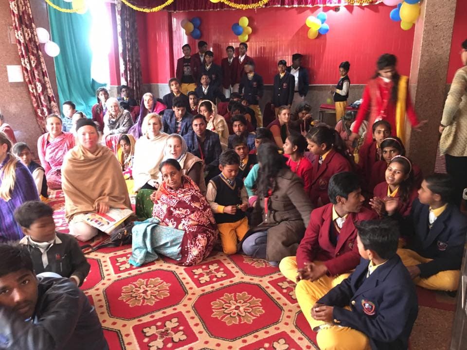 Их было много. Целый автобус. Целый автобус школьников в школьной форме, и все стремительно направлялись в Шри Радхе-кунджу. Всю эту группу гостей вели 2 хрупкие диди. По выходным они ходят распространять книги и петь киртан, а сегодня к ним подошли эти дети. Потом подошел их учитель. Его так заинтересовал наш храм, что они всем автобусом приехали в Радхе-кунджу на арати, прасад и дневной киртан.